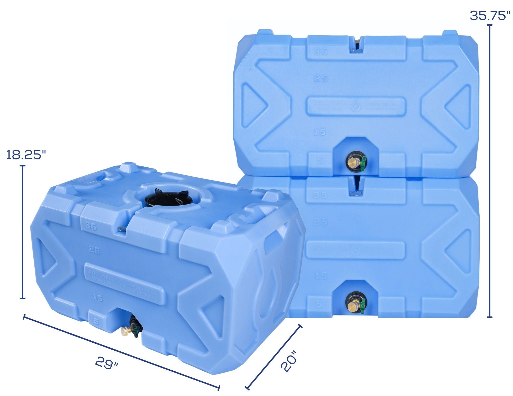 The Exodus 35 is a rugged, shock-resistant water tank built for adventure and small-space storage. Its stackable design lets you store water efficiently, making it perfect for camping, off-roading, overlanding, and truck storage.